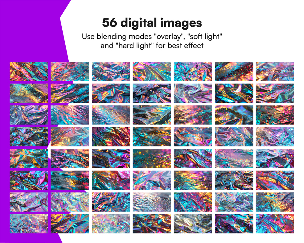 A set of 56 iridescent holographic textures with foil, metal, glitter, and bokeh effects. Pearlescent Textures, instant download commercial use, metallic backgrounds with pastel foil